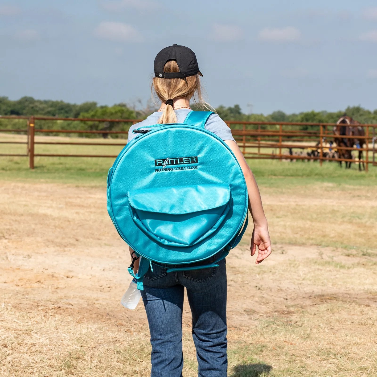 Breakaway ropers, don’t settle for just any rope bag. Choose the one that’s specifi cally designed for your event and your gear. This bag allows up to four ropes to rest without getting bound up. The lid fl ips completely open for easy access, and small essentials can be stowed in the interior and exterior pockets. The top handle has a clip to hang the bag on the fence, and carry it by the standard shoulder strap or adjustable backpack straps.